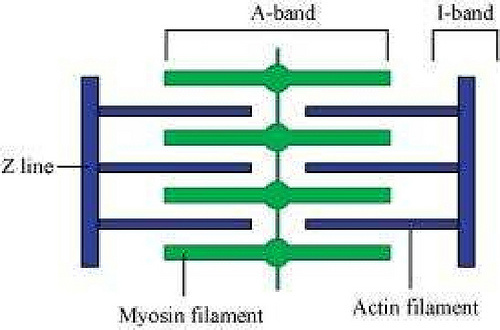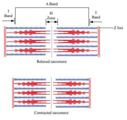 Answer The sliding filament theory explains the process of muscle contraction during which the thin filaments slide over the thick filaments, which shortens the myofibril. Each muscle fibre has an alternate light and dark band, which contains a special contractile protein, called actin and myosin respectively. Actin is a thin contractile protein present in the light band and is known as the I-band, whereas myosin is a thick contractile protein present in the dark band and is known as the A-band. There is an elastic fibre called z line that bisects each I-band. The thin filament is firmly anchored to the z line. The central part of the thick filament that is not overlapped by the thin filament is known as the H-zone. During muscle contraction, the myosin heads or cross bridges come in close contact with the thin filaments. As a result, the thin filaments are pulled towards the middle of the sarcomere. The Z line attached to the actin filaments is also pulled leading to the shortening of the sarcomere. Hence, the length of the band remains constant as its original length and the I-band shortens and the H-zone disappears.