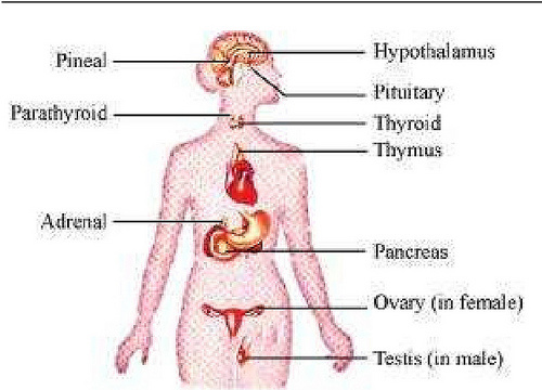 (a) Hypothalamus (b) Pituitary (c) Thyroid (d) Parathyroid (e) Adrenal (f) Pancreas (g) Testis (h) Ovary (i) Thymus