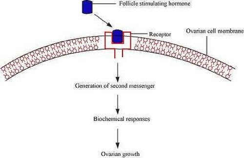 Action of FSH: Follicle stimulating hormone produces its effect by binding to its specific receptors present on the ovarian cell membrane. Binding of FSH hormone to its receptor leads to the formation of hormone receptor complex. The formation of this complex leads to biochemical changes in the ovarian follicle, present in the ovarian. The ovarian follicles mature and release a mature ovum in the fallopian tube for fertilization.