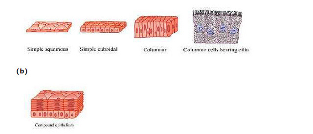 (a) Simple epithelium: It consists of a single layer of cells where cells are in direct contact with the basement membrane. It is further sub-divided into the following types: