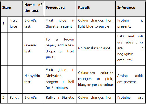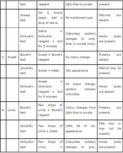 Question 13: Find out a qualitative test for proteins, fats and oils, amino acids and test any fruit juice, saliva, sweat and urine for them.