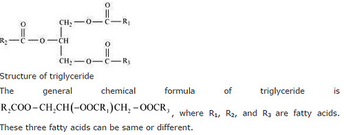 Answer Triglyceride is a glyceride, which is formed from a single molecule of glycerol, esterified with three fatty acids. It is mainly present in vegetable oils and animal fat.