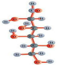 In the above ball and stick model of D-glucose, the oxygen atoms are represented by red balls, hydrogen atoms by blue balls, while carbon atoms are represented by grey balls.