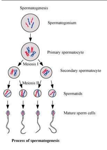 Answer Spermatogenesis is the process of the production of sperms from the immature germ cells in males. It takes place in seminiferous tubules present inside the testes. During spermatogenesis, a diploid spermatogonium (male germ cell) increases its size to form a diploid primary spermatocyte. This diploid primary spermatocyte undergoes first meiotic division (meiosis I), which is a reductional division to form two equal