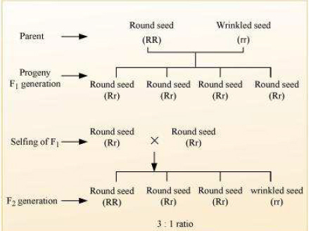 Answer Mendel’s law of dominance states that a dominant allele expresses itself in a monohybrid cross and suppresses the expression of recessive allele. However, this recessive allele for a character is not lost and remains hidden or masked in the progenies of F1 generation and reappears in the next generation. For example, when pea plants with round seeds (RR) are crossed with plants with wrinkled seeds (rr), all seeds in F1 generation were found to be round (Rr). When these round seeds were self fertilized, both the round and wrinkled seeds appeared in F2 generation in 3: 1 ratio. Hence, in F1 generation, the dominant character (round seeds) appeared and the recessive character (wrinkled seeds) got suppressed, which reappeared in F2 generation.