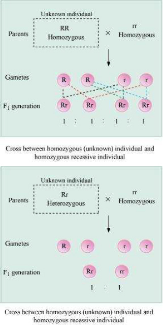 Answer Test cross is a cross between an organism with unknown genotype and a recessive parent. It is used to determine whether the individual is homozygous or heterozygous for a trait. If the progenies produced by a test cross show 50% dominant trait and 50% recessive trait, then the unknown individual is heterozygous for a trait. On the other hand, if the progeny produced shows dominant trait, then the unknown individual is homozygous for a trait.