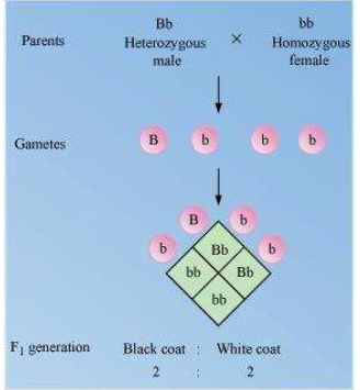 Answer In guinea pigs, heterozygous male with black coat colour (Bb) is crossed with the female having white coat colour (bb). The male will produce two types of gametes, B and b, while the female will produce only one kind of gamete, r. The genotypic and phenotypic ratio in the progenies of F1 generation will be same i.e., 1:1.