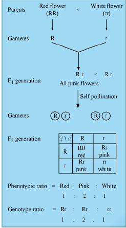 Incomplete dominance is a phenomenon in which one allele shows incomplete dominance over the other member of the allelic pair for a character. For example, a monohybrid cross between the plants having red flowers and white flowers in Antirrhinum species will result in all pink flower plants in F1 generation. The progeny obtained in F1 generation does not resemble either of the parents and exhibits intermediate characteristics. This is because the dominant allele, R, is partially dominant over the other allele, r. Therefore, the recessive allele, r, also gets expressed in the F1 generation resulting in the production of intermediate pink flowering progenies with Rr genotype.